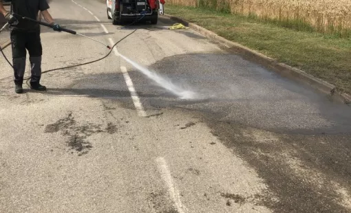 Nettoyage haute préssion d'une route suite à un débordement d'eaux usées à Colombier